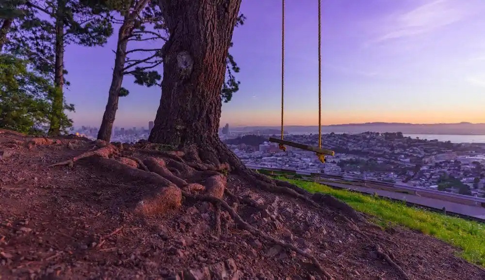 Tank Hill: Named for a massive water tank that used to be in the area (it was removed in 1957), Tank Hill offers some of the best wide views of San Francisco in the whole city. Although it is located at a much lower elevation than Twin Peaks (around 650 feet elevation vs. Twin Peaks at 922 Feet), it provides sweeping views of the San Francisco Skyline, The Golden Gate Bridge, The Bay Bridge as well as Oakland, Sausalito and more. A slightly hidden staircase off of Twin Peaks Blvd. takes you the the small park where you can take in the whole city at once. This is a great place to go for the Independence Day Fireworks if you want to avoid all of the crowds, traffic and general holiday craziness. As an added bonus, there are a couple of fun, rope swings to enjoy while you visit.
