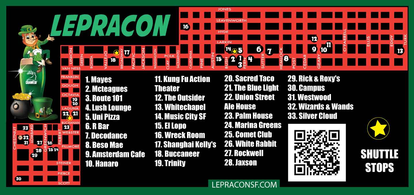 Specials will be available from 2PM to 10PM. Bars and specials will be announced closer to the event date. Check out Lepraconsf.com for updated pub crawl information.